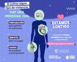 ¿Haz sufrido algún tipo de violencia? Acércate a tu Primer Contacto, el o ella te acompañará y guiará con apoyo psicológico, médico o legal durante el proceso de tu denuncia. ✨